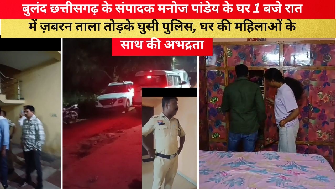 रायपुर। राजधानी रायपुर में शुक्रवार-शनिवार की दरमियानी रात एक पत्रकार के घर में पुलिस के अचानक पहुंचने से हड़कंप मच गया। जानकारी के अनुसार, बुलंद छत्तीसगढ़ के संपादक मनोज पांडे के घर पुलिस की कई गाड़ियाँ रात लगभग 1 बजे पहुंचीं और गेट तोड़कर जबरन अंदर घुस गईं। घटना के समय घर में केवल महिलाएँ मौजूद थीं।